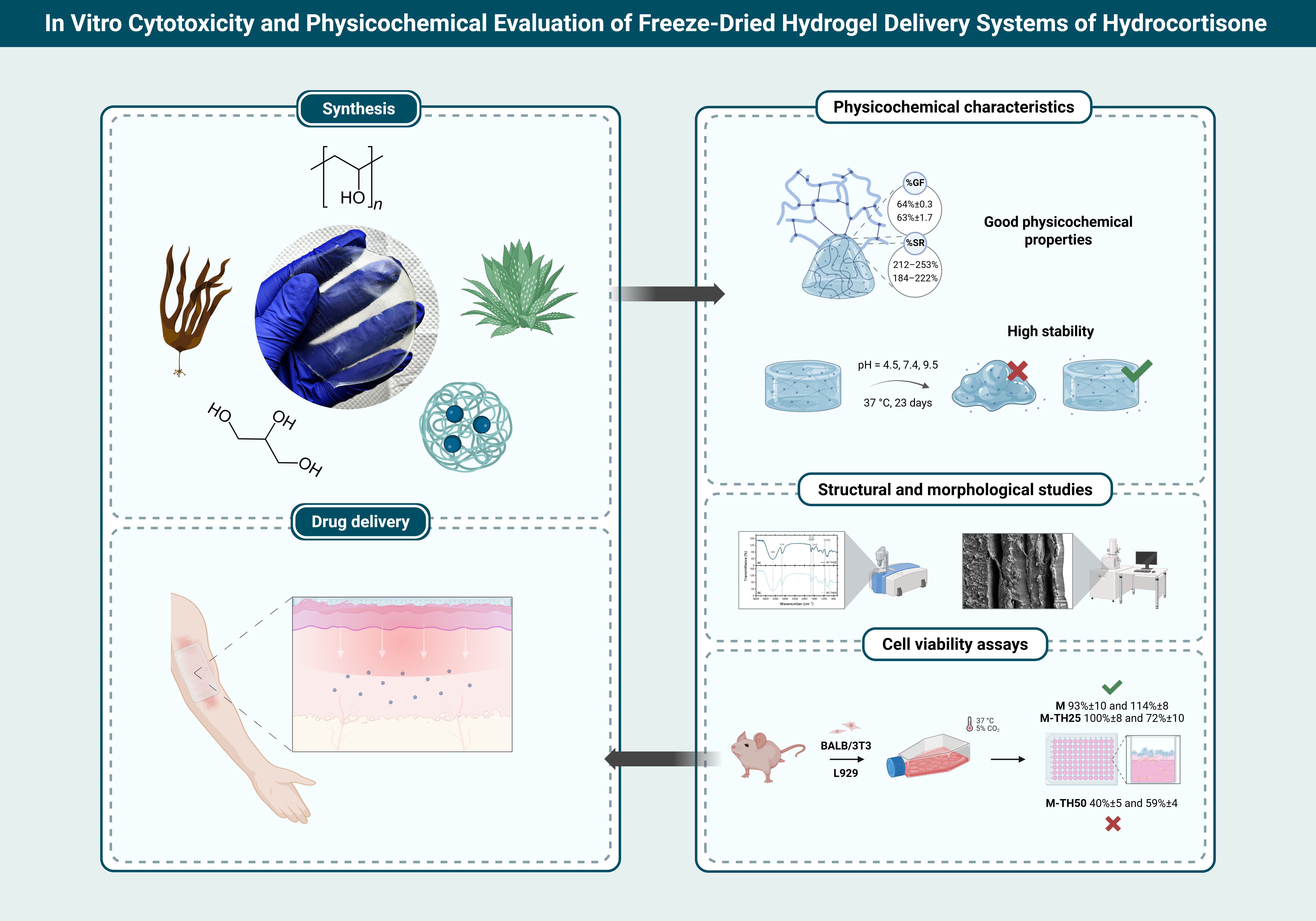 Despite the diversity of available formulations for relieving topical symptoms of chronic skin diseases, inflammation, and hypergranulation tissue resulting from burn wounds, their efficacy is limited by side effects, application inconveniences, including the oiliness of the formulations, and the need for frequent application, which can affect patient compliance. Therefore, research has been carried out on freeze-dried hydrogel delivery systems of hydrocortisone, to evaluate their physicochemical (gel fraction, swelling ratio, pH and conductivity measurements), structural (FTIR), and morphological (SEM) properties, as well as their cytotoxicity (MTT tests). The gel fraction of freeze-dried hydrogel biomaterials (M-TH25 and M-TH50) reached 64% ± 0.3 and 63% ± 1.7, respectively, slightly higher than for the reference matrix (M) (61 ± 0.8). The swelling ratio (pH = 7.4) was in the range of 212–253% and 184–222%, respectively, comparable to the reference sample (208–277%). The incorporation of a thermosensitive polymeric nanocarriers (poly-N-isopropylacrylamide copolymers) containing hydrocortisone in the quantitative range 25–50 mg did not significantly change the overall morphology of the biomaterials. Both M and M-TH25 samples exhibit non-cytotoxicity towards mouse fibroblast cells BALB/3T3 (93% ± 10; 100% ± 8) and L929 (114% ± 8; 72% ± 10) cells with an observable variation in response for the M-TH25 sample, likely due to differences in cell behaviour and surface area. Importantly, M-TH50 sample shows cytotoxic effects (40% ± 5; 59% ± 4) mainly resulting from an excessively high concentration of the incorporated active substance. Further studies are planned (including on the release profile and kinetics of hydrocortisone and the assessment of the therapeutic effect), which may help to select an appropriate concentration of drug in the quantitative range 25-40 mg.