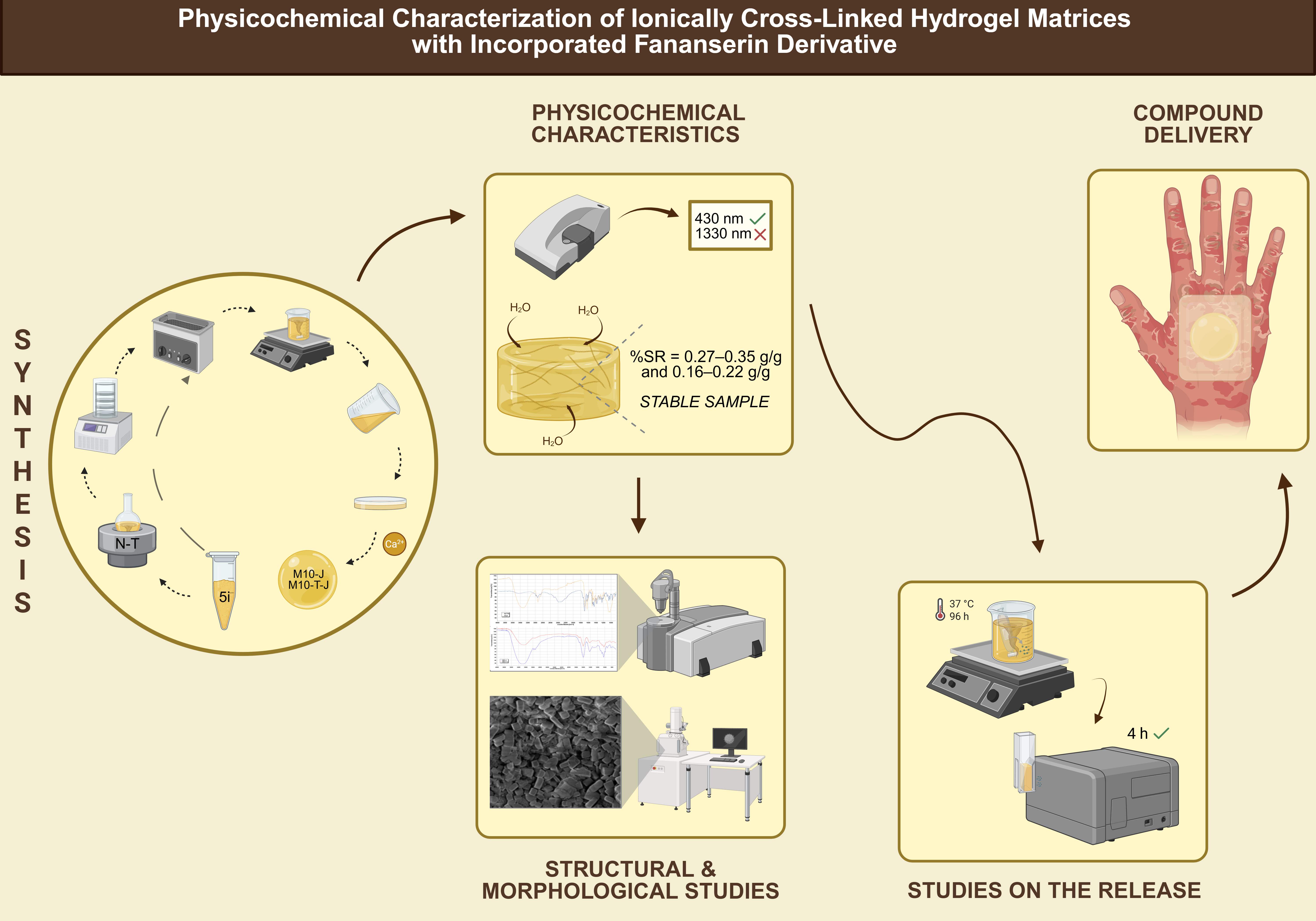 The fananserin derivative, such as 1-{6-[4-(2-fluorophenyl)piperazin-1-yl]hexyl}-benzo[cd]indol-2(1H)-one (compound FL-4), represents an interesting biologically active substance that can be incorporated into polymeric carriers. Due to its highly hydrophobic nature and poor solubility in conventional solvents, FL-4 was incorporated into a delivery system to improve its solubility, stability, and bioavailability. Based on preliminary studies and DLS analysis, an optimal concentration of FL-4 (10 mg) was selected, ensuring system stability. This system was incorporated into polymer matrices, resulting in two hydrogel delivery systems: M10-J, containing FL-4, and M10-T-J, which combines a thermosensitive nanocarrier with FL-4, both ionically cross-linked. The systems were evaluated for their physicochemical properties, including swelling abilities, degradation, chemical structure (based on FTIR spectra analysis), morphology (based on SEM images), and substance release profiles. The M10-T-J samples showed a swelling ratio of 0.27 g/g in PBS and 0.35 g/g in water, while M10-J exhibited 0.16 g/g in PBS and 0.2 g/g in water. The pH and conductivity analysis suggested a faster degradation process for M10-T-J hydrogel compared to M10-J. FT-IR analysis confirmed the chemical structure of the materials, revealing significant changes in M10-T-J samples, indicating interactions between FL-4 and CaCl₂ used during cross-linking. SEM and EDS analysis showed a uniform distribution of FL-4 on the matrix surface in both hydrogel variants, with the addition of the thermosensitive nanocarrier not significantly affecting the morphology. The M10-J hydrogel exhibited rapid release of FL-4 within the first 4 h, while M10-T-J showed limited release.
